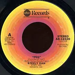 "Peg" is a song by the American rock group Steely Dan, first released on the band's 1977 album Aja. The track was released as a single in 1977 and reached number 11 on the US Billboard chart in 1978 and number eight on the Cash Box chart.[4] With a chart run of 19 weeks, "Peg" is tied with "Rikki Don't Lose That Number" and "Hey Nineteen" for being Steely Dan's longest-running chart hit. In Canada, "Peg" spent three weeks at number seven in March 1978.[5]