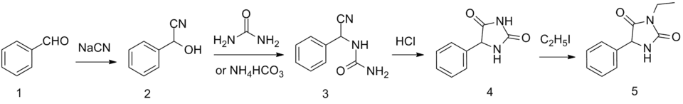 Ethotoin is synthesized by the reaction of benzaldehyde oxynitrile (2) with urea or ammonium bicarbonate, which forms an intermediate urea derivative (3) which on acidic conditions cyclizes to 5-phenylhydantoin (4).[5] Alkylation of this product using ethyl iodide leads to the formation of ethotoin (5).