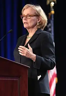 Recurring themes in Noonan's books and columns include the decline of civility, social graces, religiosity, patriotism, bipartisanship and statesmanship in contemporary American politics and society, as well as enduring praise for past conservative political figures such as Ronald Reagan and George H. W. Bush. As a result, her writing is criticized for being overly nostalgic.[29] In June 2019, after Noonan called on congressional Democrats to censure President Trump in the wake of the Mueller report, he attacked her on Twitter, calling her "simplistic" and claiming that she "is stuck in the past glory of Reagan".[30][31] In June 2022, Trump issued a statement calling Noonan a "weak and frail RINO... who did much less for Ronald Reagan than she claims, and who actually said bad things about him and his ability to speak" after she wrote in the Wall Street Journal that the Republican Party was "rejecting" Trump in the aftermath of the 2021 United States Capitol attack.[32]