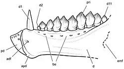 A postorbital is known for Pegomastax, with a deep rear process more similar to Manidens than Heterodontosaurus. The predentary of Pegomastax is a simple wedge-shaped bone. Like Heterodontosaurus there are no prominent processes, and the predentary sits on a loose and possibly mobile saddle-like articulation at the front of the dentary. Several foramina perforate the dental edge of the predentary, which is angled about 45 degrees below horizontal, and would have supported a keratinous bill. Unlike all other heterodontosaurs the predentary is much taller than long, with the length of the dental margin only 70% of the total height of the bone.[1] Pegomastax has a robust dentary, with the tooth row being 27 mm (1.1 in) and a depth at mid-length of 9 mm (0.35 in). For comparison, the dentary of Heterodontosaurus has an equivalent depth of 10 mm (0.39 in) and a length of 42 mm (1.7 in), though the dentary of Manidens is slightly deeper than Pegomastax. The teeth in the dentary are inset from the cheek by a buccal emargination, and a foramina at the front end of this emargination near the predentary exists, but does not contain a tract as in Echinodon and Fruitadens. The anterior end of the dentary is deeper than the middle, as in Heterodontosaurus and Abrictosaurus.[1]