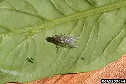 Pegomya hyoscyami, the beet leafminer or spinach leafminer, is a grey fly about 6 millimetres (0.24 in) long. It emerges in April–May and lays eggs on the undersides of leaves of beet, spinach, chard, and other greens. Eggs develop into larvae that burrow into the leaf hollowing out large patches of the leaf between leaf surfaces, often killing large parts of the leaf.
