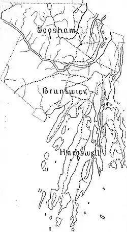 - ^ a b c d e f g h Wheeler, George Augustus; Wheeler, Henry Warren (1878). History of Brunswick, Topsham, and Harpswell, Maine: Including the Ancient Territory Known as Pejepscot (1st ed.). Boston: A. Mudge & Sons, Printers. pp. 7–8. LCCN 01008940. Archived from the original on 1 April 2023. Retrieved 22 March 2023 – via Google Books. p. Inside Front Cover – Pejepscot Historical Society second ed. (1974):