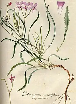 Nikolaus Joseph von Jacquin first described this species in part 3 of his publication lcones Plantarum Rariorum of 1794, giving it the name Pelargonium coronopifolium. He based it on a herbarium specimen from an unknown location and collector, but annotated in his own handwriting. In 1803, Gábor Andreánszky reassigned it to the genus Geranium, creating the combination Geranium coronopifolium. The "father of South African botany", Carl Peter Thunberg described another plant from his own collection, from Caput Bonae-Spei (a term used at that time for the larger Cape region), but again from an unknown collector, and he called it Geranium ellipticum in 1823. Already in 1824, the famous Swiss botanist Augustin Pyramus de Candolle reassigned Thunberg's plant to the genus Pelargonium, making the new combination P. ellipticum. In 1835, Christian Friedrich Ecklon and Karl Ludwig Philipp Zeyher described a plant they had collected themselves at Heerenlogement in the Cape Province, and assigned it to the genus Campylia that had been erected by Robert Sweet in 1820, calling it Campylia staticephylla. Ernst Gottlieb von Steudel gave the new but illegitimate name Campylia staticaefolium to Ecklon and Zeyher's plant in 1841. William Henry Harvey in 1860 distinguished P. coronopifolium variety lineare. A form with narrow leaves from Gydo Pass was collected and described by Harry Bolus in 1889, who called it Pelargonium gramineum. A second form with narrow leaves, but flowering later in the season with white to pale pink flowers, found in the Cederberg Mountains was named by Reinhard Knuth Pelargonium angustissimum. He described it in a book by Ernst Heinrich Friedrich Meyer in 1912. Since the structure of the flowers of all these forms is identical, they have the same number of chromosomes, the extremes in leaf shape grade into each other and the distribution is not disjunct, J.J.A. van der Walt and Loretta van Zyl-Hugo in their revision of Pelargonium section Campylia of 1988, considered all of these names synonymous.[1]