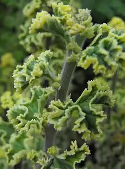 The leaves are small (10mm diameter), green, lemon-scented, fan-shaped, and have distinctively crisped (crinkled or wavy) edges.