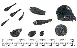 Pele's tears are interesting to volcanologists because trapped within the glass droplet are bubbles of gas and particles called vesicles.[3] When these are analyzed they can provide a great deal of information about the mechanisms of an eruption. For instance, the shape of a vesicle can provide an indication of the velocity of the eruption. When vesicles form within the lava they are spherical in shape. If the eruption is turbulent the vesicles will deform and become elongated in shape. If the velocity is low they will retain their spherical shape as in the case of Pele's tears.