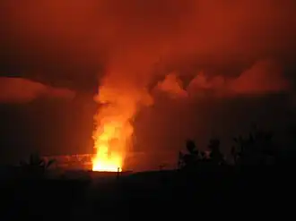 Kīlauea is a currently active volcano that is located on the island of Hawaiʻi and is still being extensively studied.[6] Many Hawaiians believe Kilauea to be inhabited by a "family of fire gods," one of the sisters being Pele who is believed to govern Kilauea and is responsible for controlling its lava flows.[7] There are several traditional legends associated with Pele in Hawaiian mythology. In addition to being recognized as the goddess of volcanoes, Pele is also known for her power, passion, jealousy, and capriciousness. She has numerous siblings, including Kāne Milohai, Kamohoaliʻi, Nāmaka, and numerous sisters named Hiʻiaka, the most famous being Hiʻiakaikapoliopele (Hiʻiaka in the bosom of Pele). They are usually considered to be the offspring of Haumea. Pele's siblings include deities of various types of wind, rain, fire, ocean wave forms, and cloud forms. Her home is believed to be the fire pit called Halemaʻumaʻu at the summit caldera of Kīlauea, one of the Earth's most active volcanoes, but her domain encompasses all volcanic activity on the Big Island of Hawaiʻi.[8]