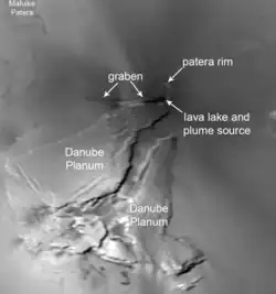 Pele has a volcanic crater, also known as a patera, 30 km (19 mi) by 20 km (12 mi) in size,[5] which lies at the base of the northern tip of the mountain Danube Planum. The patera has multiple floor levels, with a higher north-eastern section and a lower section that consists of an east-west-trending graben.[13] Volcanic activity at Pele, as seen in images taken by Galileo in October 2001 while Pele was on Io's night side, appears to be limited to small thermal "hot-spots" along the margins of the patera and a more intense thermal emission source within a dark area in the southeast portion of the patera floor.[5] This distribution of activity, combined with Pele's stability as a hotspot in terms of temperature and power emitted, suggests that Pele is a large, active lava lake, a combination of eruption style and intensity of activity not seen elsewhere on Io.[13] The small hotspots seen in the Galileo data represent areas where the crust of the lava lake breaks up along the margins of the patera, allowing fresh lava to become exposed at the surface.[5] The southeastern portion of the patera, an area of dark terrain in Voyager 1 imagery, is the most active region of the Pele volcano, with the most extensive region of hot lava at Pele. This area is thought to be a vigorously overturning lava lake, suggestive of a combination of a large mass flux of lava to the lake from a magma reservoir below the surface and a large mass fraction of dissolved volatiles like sulfur dioxide and diatomic sulfur.[13] Given Pele's brightness at near-infrared wavelengths, activity at this portion of the lava lake may also result in lava fountaining.[13][14]