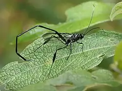 Pelecinus polyturator is a species of wasp in the family Pelecinidae. The large (up to 7 cm) glossy black insects are the most common and well-known members of the family. The adults drink nectar, and they live in crop fields, woods, and suburban gardens throughout North, Central, and South America. Their antennae are long and the females have an elongated, cylindrical, articulated metasoma. They are parasitoids that lay their eggs directly into grubs of the June beetle (genus Phyllophaga) buried in the soil. The adults can be found in the late summer.