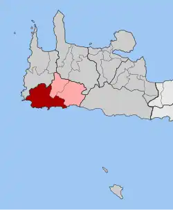 Pelekanos (Greek: Δήμος Πελεκάνου) is a former municipality in the Chania regional unit, Crete, Greece. Since the 2011 local government reform it is part of the municipality Kantanos-Selino, of which it is a municipal unit.[2] The municipal unit has an area of 166.618 km2 (64.332 sq mi).[3] Pelekanos is in the south west corner of the island, part of the rugged and remote Selino Province. The Venetians built a castle - Kastel Selinou - at Palaiochora, giving the region its name. Palaiochora is now a growing coastal resort and the capital town of the municipality.