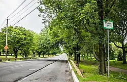 The road, a six-lane divided boulevard, crosses under the New York City Subway's IRT White Plains Road Line (the 2 and 5 trains) at the Pelham Parkway station at an intersection with White Plains Road. The parkway continues east through the Morris Park neighborhood, passing and intersecting with Williamsbridge Road, which leads to the Jacobi Medical Center. At this intersection, the parkway also crosses over the IRT Dyre Avenue Line (the 5 train) at the underground Pelham Parkway station on that line. The parkway bends eastward, crossing Eastchester Road, then Stillwell Avenue merges into the parkway, marking the eastern end of the service roads.[3]