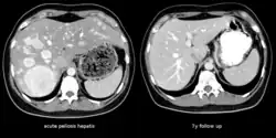 | The CT scan of a patient with peliosis hepatis (left): The follow-up CT (right) after 7 years shows full remission. | |