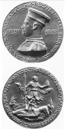 A medal showing Pellegrino Prisciano in profile located at the British Museum today.