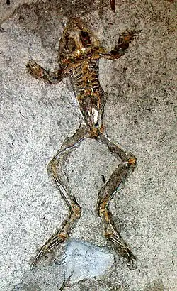 It is known from a Konservat-Lagerstätte in the Libros sulphur mines of Teruel , where it is abundant.[ 3] [ 4] Fossils of both adults and tadpoles are known.[ 5]