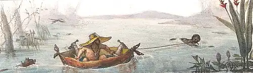 It also served to convey those who could not swim, or would not. In the colonial era, Spanish military commanders, though they knew how to swim, held it was beneath their dignity to strip in front of the common soldiery, and were conveyed by pelota; "scorning the assistance of another person, they impel forwards by two forked boughs for oars".[33] The Rodrigues Ferreira expedition to the Mato Grosso (c. 1785) drew indigenous people taking their children across in pelotas, propelled by pairs of women.[34]