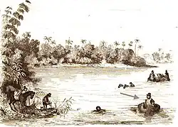 The hide boat was towed across the river, either by a swimmer pulling a cord with his teeth, or by a bullock, or by holding onto the tail of a horse.[10] In the Mato Grosso a second swimmer helped to guide it and push it from behind.[14][17]