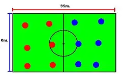 Traditionally the game is played around a block of houses or along four streets,[1] about 6─8 metres wide and 150─200 metres long.[3][7] The game has since been adapted to be played in parks.[1] The surfaces are very diverse and they have included snow, such as played by Latin students at Cornell University.