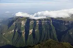 The basinal sequence starts with the Imbituba Formation, a unit consisting of basaltic volcanic rocks. Parts of these rocks have been dated at ages between 125 ± 0.7 Ma and 118 ± 1.9 Ma, more recent than the flood basaltic Serra Geral Formation of the Paraná and Etendeka traps to the west in the Paraná Basin.[10] The basalts are exposed in the Serra Geral National Park as a 700-metre-high (2,300 ft) cliff.[13] The volcanic deposits form seaward dipping reflectors (SDR) in the seismic surveys of the basin.[14] The conglomerates, siltstones and diamictites of the Cassino Formation represent the top of the Gondwana break-up unconformity, dates to the Middle Aptian.[15] The depositional environment has been interpreted as fluvio-deltaic to lacustrine. The formation is followed by the volcanics of the Curumim Formation, dated at 113 ± 0.1 Ma, and small incursions in the northern area of Pelotas Basin of the Ariri Formation, the evaporites that form the salt layer in the Santos Basin to the north.[16]