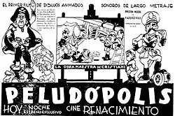 Peludópolis is a 1931 Argentine animated film directed by Quirino Cristiani.[1] It was released on 18 September 1931 in Buenos Aires.[2] The film was released with a Vitaphone sound-on-disc synchronization system soundtrack, making the film generally credited as the first animated feature film with sound. The film is now considered a lost film.