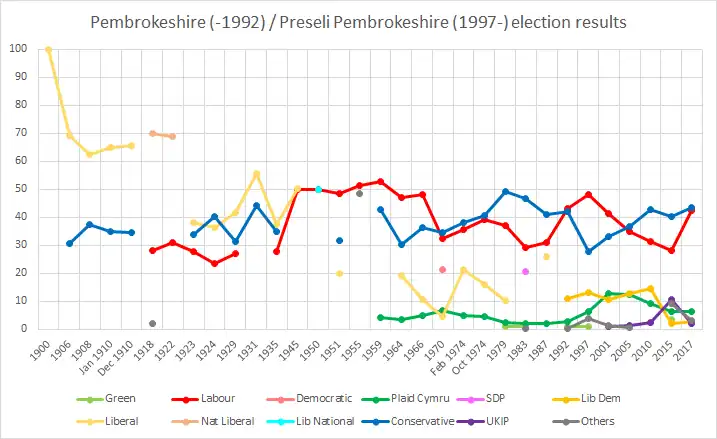 The constituency was abolished for the 1997 general election, when its territory was divided between the new constituencies of Preseli Pembrokeshire and Carmarthen West & South Pembrokeshire. Up to 1950 it was generally considered a Liberal seat, although won by the Conservatives on some occasions. From 1950 it was regarded as a fairly safe Labour seat. However, the Conservatives won the seat in 1970 when the sitting Labour MP Desmond Donnelly left the party and formed The Democratic party. Donnelly lost the seat but polled well. In subsequent elections the Conservative vote held up, tending to suggest that Donnelly had held the seat with large majorities for Labour based on his own popularity as much as being the Labour candidate.