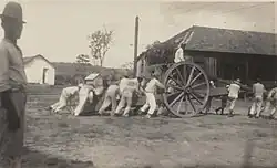 There was now "plenty of manpower" after the arrival of large numbers of prisoners, according to Rogério Alicino's official narrative.[100] For historians like Romani and Brito, Clevelândia was a forced labor camp.[34][87] Gentil Norberto, in his defense of the colony, stated that only common criminals had been forced to work, and for only four and a half hours a day, cleaning the headquarters and other services, and received cigarettes and small wages.[101] Writer Domingos Meirelles mentioned a nine-hour workday, in most cases without pay.[82] A former soldier of the Public Force of São Paulo, in a statement to O Combate, described more than twelve hours of heavy duty a day.[102]