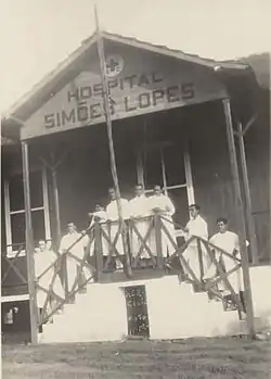 A former Public Force soldier reported how in the morning prisoners were forced to gather the bodies of their comrades who died during the night.[132] The number of deaths was five per day and reached twelve at its peak, according to Lauro Nicácio,[108] and the "cemetery group" went to the hospital at dawn to check the number of deaths. He attributed the illnesses to the lack of a balanced diet.[133] Carlo Romani highlighted the unsanitary conditions and the insufficiency of medicine and medical staff.[134] Treatments at the Simão Lopes Hospital were limited to quinine tablets or injections. The hospital administered 120 injections per day with just two needles, which became blunt with intensive use, causing ulcers and edema in the patients' skin.[135] The one hundred beds in the hospital and 88 in the infirmary, nicknamed the "death ward", were not enough, and many patients waited outside for a place. Some died in their shelters.[108] According to Domingos Braz, "Oiapoque is a place without medical resources", where "hygienic and sanitary precepts themselves are unknown".[92]