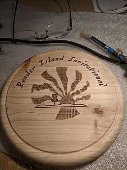 It is made from a piece of gnarled wood from an arbutus (or Pacific Madrone) tree and has the names of past champions (Keepers of The Bark) engraved upon it. The Bark was salvaged from the Golf Island Disc Park, where arbutus trees are abundant.