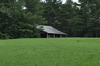 Pendle Hill is located on the crest of a low ridge paralleling both US 202 and the southeastern shore of China Lake, north of the village of South China. The house itself is set on the edge of a small wooded area, with a view down the west side of the ridge toward the lake, across a cleared meadow. The meadow is separated from the lake by a wooded area. The house is a modest 1+1⁄2-story Shingle style structure, with a gable roof that changes pitch to extend on the west side over a porch, with shingled square posts for support. The interior is finished in stained pine, and is modestly styled, with exposed roof trusses.[2]