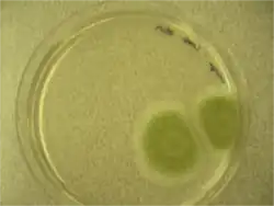 If the fungus has colonized the fruit with mycelium, the formation of conidiophores occurs on the surface or subsurface of the hyphae. The conidiophores are mostly smooth-walled terverticillate penicilli. A terverticillate pencilii has multiple branch points below the phialides, the cells that the conidia are attached to. However, at times, the penicilli may be rough or biverticillate (only two levels of branching).[16] The phialides are packed close together with nearly a cylindrical shape.[17] The conidia are dry, smooth, elliptical, and "dull-green" in color and are often disseminated by wind currents.
