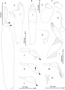 The species was distinguished from other congeners by (1) the presence of a conical process anterior to the rostrum; (2) the secondary elongation of the first pedigerous somite; (3) the incorporation of the third and fourth pedigerous somites into the trunk; (4) the unilobate maxillule bearing two unequal apical setae; (5) the lack of any processes on the first segment of the maxilla.[2]