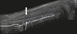 Figure 6: Transverse ultrasound of the penis, in a ventral view, in the middle portion of the penis. Note the echoic image with posterior acoustic shadowing, corresponding to calcification (arrow), in the left corpus cavernosum.[1]