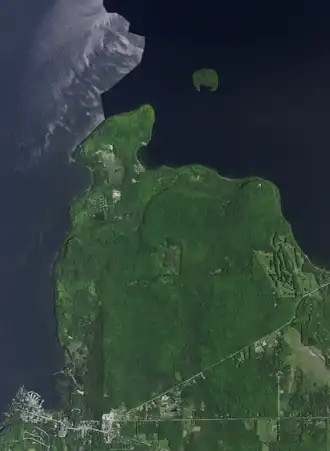 Horseshoe Island is part of the park and is the only nearby island owned by the state. Located in Green Bay, the island is accessible by private boat.[19] It has no establishments other than a pit toilet, a hiking trail and the foundations of buildings once occupied by the Folda family in the 1890s.[20] The French explorer Jean Nicolet reportedly landed briefly on the island.[21]