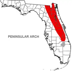 The Peninsular Arch parallels the Ocala Platform to its west and is the dominant sub-surface feature within Florida. It is a structurally high area which affected deposition of sediments during the Cretaceous to the early Cenozoic. It was a high topographic feature during most of the Cretaceous but was covered with Late Cretaceous sediments and became an ideal base and settling point for carbonate sediments during the Eocene when that portion of land was submerged.[1] According to Williams and T. M. Scott, the arch did not affect sediments from depositing during the Neogene through Holocene.[2][3]