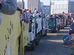 In larger towns, the penkkarit culminate at a parade where the lorries drive across the city at a slow speed, and the final-year students on top of them shouting slogans and throwing candy at passers-by. The event is particularly popular among children, who come to the streets to collect free candy. For example, in April 2022 there were more than 4000 local final-year students in individual lorries and trucks that drove the students in around Central Helsinki.[3]