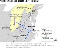 The PennEast Pipeline is a proposed project by PennEast Pipeline Company, LLC, a consortium of five energy companies, to move natural gas from the Marcellus Shale region in Pennsylvania to New Jersey. The proposed 36-inch (910 mm) pipeline would run from Dallas, Luzerne County to Pennington, Mercer County, New Jersey, a distance of approximately 115 miles (185 km); as currently contemplated, the maximum allowable operating pressure would be approximately 1,480 psi.[1] The pipeline requires the condemnation of properties in the state of New Jersey, which the state has opposed. A ruling against such condemnation was handed down in September 2019.[2]