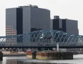Penn Plaza East is an office building complex located near Penn Station in Newark, New Jersey. Fronting Raymond Boulevard on the banks of the Passaic River, the two office building complex were constructed during a period in the late 1980s and early 1990s when they and numerous postmodern skyscrapers were built near the station and Gateway Center. While others went up between the station and traditional Downtown Newark, Penn Plaza East is on the Ironbound, or east, side of the major transportation hub.[6] The two towers sit above a four-story parking facility and lobby that joins them. An additional parking area in the shadow of the Dock Bridge will be developed as part of Newark Riverfront Park, a promenade along the banks of the Passaic River.[7][8]