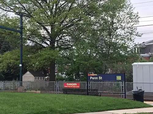 Penn Street station is a stop on the D in Clifton Heights, Pennsylvania. It is officially located near Penn Street and Broadway Avenue, although the actual location on Penn Street is halfway between Broadway and Berkley Avenues. Because the station runs through a residential neighborhood, no parking is available.