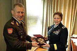 The Pennsylvania–Lithuania National Guard Partnership is one of 25 European partnerships that make up the U.S. European Command State Partnership Program and one of 88 worldwide partnerships that make-up the National Guard State Partnership Program.[2] The Partnership was established on April 27, 1993. In the 30 years that have followed, Pennsylvania and Lithuania have conducted more than 500 exchanges that cover diverse topics such as Senior Leader Engagements, Recruiting, NCO Professional Development, Military Decision Making Process and Strategic Planning, Range Development, Airfield Development and Standards, Defense Support to Civil Authorities, Family Programs, and Resiliency. Also, Pennsylvania and Lithuania have jointly deployed to Afghanistan in support of ISAF, including four rotations of a Police Operational Mentor and Liaison Team. Pennsylvania also provided nine rotations of a team of Logistics Advisors to the Lithuanian led Provincial Reconstruction Team in the Gowhr Province. Pennsylvania and Lithuania are looking at other opportunities to jointly deploy to further expand the relationship between their militaries.
