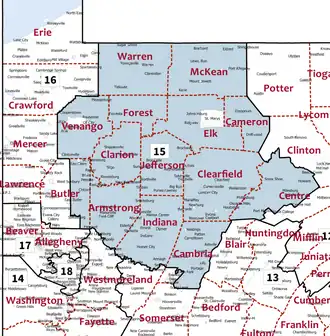 Pennsylvania's 15th congressional district has been located in western and central Pennsylvania since 2019. Since 2023, the district includes all of Armstrong, Cameron, Centre, Clarion, Clearfield, Clinton, Elk, Forest, Jefferson, McKean, Potter, Snyder, Tioga, Union, and Warren counties and parts of Indiana, Lycoming, and Venango counties.