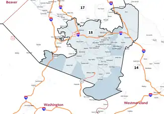 In February 2018, the Supreme Court of Pennsylvania ruled that the district map violated the state constitution due to gerrymandering and redrew all of the state's congressional districts. The 18th and 14th districts swapped numbers and had their boundaries adjusted for the 2018 elections (after March's special election) and thereafter.[1][2]