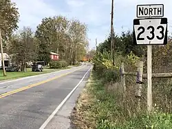 When routes were legislated in Pennsylvania in 1911, what is now PA 233 was designated as part of Legislative Route 191 between Dickinson and Green Park.[7] PA 233 was designated in 1928 to run from US 11 (Walnut Bottom Road) in Dickinson north to PA 33 (now PA 34) in Dromgold, following its current alignment north to Landisburg before it continued to the east. Upon designation, the route was paved between Dickinson and south of Doubling Gap while the remainder north to Dromgold was unpaved. In 1928, the road between Landisburg and Green Park was designated as part of PA 74, which was unpaved. At this time, the road between Mont Alto and US 30 was an unnumbered paved road.[8] By 1930, the section of PA 74 between Landisburg and Green Park was paved. By this time, the roadway between Pine Grove Furnace and Dickinson was an unnumbered unpaved road.[9] PA 233 was extended south from Dickinson to PA 997 in Mont Alto in 1937.[10][11] In 1937, PA 233 was realigned at Landisburg to head north to PA 17 in Ickesburg, following its current alignment to Green Park before continuing north to Ickesburg. The realigned PA 233 replaced a section of PA 74 between Landisburg and Ickesburg while the former alignment of PA 233 between Landisburg and Dromgold became part of an extended PA 850.[12] The entire length of the route was paved in the 1930s with the exception of a portion to the north of Doubling Gap.[11] In the 1940s, the north end of PA 233 was cut back to its current location at PA 274 in Green Park, with the section immediately to the north of PA 274 becoming unnumbered Green Park Road and the remainder of the road between north of Green Park and Ickesburg becoming a northern extension of PA 74. The section of the route north of Doubling Gap was paved and straightened in the 1940s.[13]