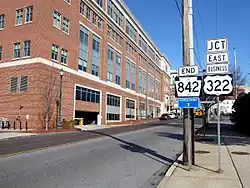 After this, PA 842 turns northeast onto Creek Road and winds northeast through fields and woods. The route splits from Creek Road and continues northeast on West Miner Street as it heads through wooded areas with some homes. At the Bradford Avenue intersection, the road crosses into the borough of West Chester and continues through residential areas. Here, PA 842 splits into a one-way pair. The eastbound direction turns northwest onto South Brandywine Street before heading northeast onto West Market Street, entering the commercial downtown of West Chester and ending at the eastbound direction of US 322 Bus. at the intersection of West Market Street and New Street. Westbound PA 842 begins at US 322 Bus. at the intersection of South High Street and Miner Street and runs west along West Miner Street past homes.[2][3]