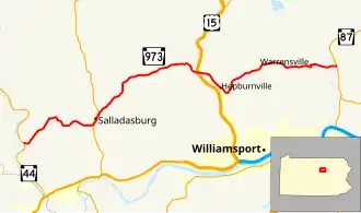 Pennsylvania Route 973 (PA 973) is a highway which runs for 27.3 miles (43.9 km), generally east–west in Lycoming County in north central Pennsylvania in the United States. Its western terminus is on the east bank of Pine Creek at PA 44 in the unincorporated village of Tomb (or Tombs Run) in Watson Township, and its eastern terminus is at the hamlet of Loyalsockville in Upper Fairfield Township at PA 87.