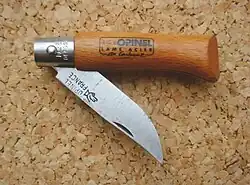 In modern production, the smallest models of the Opinel, a late 19th-century peasant's knife, continue to use this basic design, consisting of a folding blade pivoting on an axle mounted through a steel-bolstered wooden handle.[4]