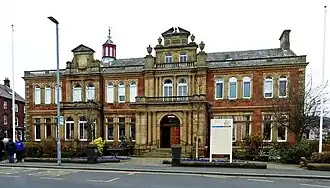 The new structure was designed by the district surveyor, J. J. Knewstub, in the Renaissance Revival style, built in red sandstone from Lazonby with buff sandstone dressings from Stanton Moor and was completed in 1906.[1] The design involved an asymmetrical main frontage with six bays facing onto Corney Square.[1] The second bay on the left, which slightly projected forward, featured a pair of round headed windows on the ground floor flanked by Corinthian order pilasters supporting an entablature and a balustrade; there were two round headed windows on the first floor separated by a Corinthian order column and flanked by Corinthian order pilasters supporting a modillioned cornice and, at roof level, there was a blind dormer containing a panel bearing the coat of arms of the town.[1] The fourth bay on the left, which was also elaborate and also slightly projected forward, featured a short flight of steps leading up to a doorway with a fanlight flanked by pairs of Corinthian order columns and, beyond that, Corinthian order pilasters supporting an entablature inscribed with the words "Town Hall" and a balustrade; there were two round headed windows on the first floor flanked by columns and pilasters supporting a modillioned cornice and, at roof level, there was a dormer window with a broken pediment and a pair of urns.[1] The other bays contained three-light windows on both floors.[1] Internally, the principal room was the council chamber on the first floor.[5]