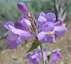 They have opposite leaves, partly tube-shaped, and two-lipped flowers and seed capsules.[5] The most distinctive feature of the genus is the prominent staminode, an infertile stamen.[6] The staminode takes a variety of forms in the different species; while it is typically a long straight filament extending to the mouth of the corolla, some are longer and extremely hairy, giving the general appearance of an open mouth with a fuzzy tongue protruding and inspiring the common name of "beardtongue".[6]