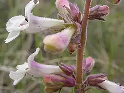 The flowers of Penstemon albidus have sepals (calyx lobes) that are 4–7 mm long, 1.5–3 mm wide, pointed, and also covered in glandular hairs.[10][4] The flower is white, occasionally tinged with a delicate shades of lavender, blue, or pink,[10] possibly due to crossbreeding with other species.[8] The flowers often have nectar guides extending from the mouth of the flowers down the lower interior of the flower tube toward the back that are red or magenta, often quite dark in contrast with the rest of the flower.[10][8] The overall shape of the flower is a funnel 12–20 mm in length and 6–8 mm in diameter.[4] The tube of the flower is not constricted at the opening and 4–6 mm long and 6–8 mm in diameter. Internally it is also glandular pubescent.[10] In the sunlight the edges of its flowers will glisten slightly due the numerous hairs.[12] P. albidus tends to have larger flowers in the north of its range than in the south of its range.[13]