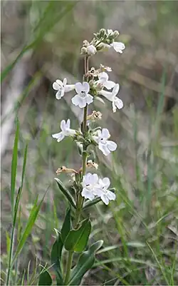 Penstemon albidus, commonly known as white penstemon,[3] white-flower beardtongue,[4] or Red-Line Beardtongue[5] is a very widespread perennial flower of the mixed-grass and shortgrass prairies.[4] Its natural distribution is from Manitoba and Alberta in Canada to Texas and New Mexico in the United States.[6] The bright white flowers for which they are named are quite attractive to both bees[7] and hummingbird moths.[8][9]