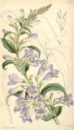 The upper part of each stem is an inflorescence 3 to 30 centimeters long that is secund, with all the flowers facing one direction. The flowers are in three to twelve groups growing from nodes with egg shaped to lanceolate bracts immediately under them. In each node there are two cymes, branched flower stems, each with two to four flowers.[6] The flowers have sepals that are fused with five lobes surrounding the base of the floral tube that have edges that are erose, having an uneven edge as if it were nibbled away.[7] Flower colors vary from plant to plant, purple, blue-purple, or even rich turquoise blue, though on some plants flower buds blush pink.[8] Inside of the flower's tube the color is paler, but with dark red-purple nectar guides.[7] Each flower is moderately bilabate, two lipped, with two lobes on the upper lip and three on the lower.[9] The length of the flower is 24–48 millimeters with a diameter of 8–18 mm. The longer pair of stamens can just reach the opening of the flower, but usually all the stamens are contained inside the floral tube. The staminode, the sterile modified stamen, is sparsely covered in woolly hairs that are pale-yellow and as long as 1.5 mm. Its length of 15 to 22 mm means that it can extend slightly beyond the flower's mouth or be entirely contained like the stamens.[6]