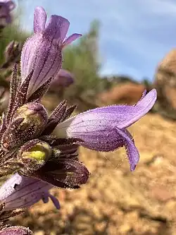 The inflorescence has the flowers more or less all facing to one side and four to nine groups of flowers with bracts 1.2–7 centimeters long under each. In each group there will be two cymes with between one and seven flowers, though usually at least three.[3] The flowers have a ground color of lavender, violet, or blue-violet with bold deep purple nectar guides on all the flower lobes. Very rarely, they may be white.[7] The flower is 14 to 22 millimeters long with an opening 7–11 mm in diameter that expands abruptly towards the front and is not constricted.[3] The flower's throat is white other than the purple nectar guides and covered in soft, white glandular hairs.[7] The staminode is obviously exserted, extending out of the flower's opening, and thickly covered in long yellow hairs. Blooming may be as early as the end of May or as late as the start of July.[4]