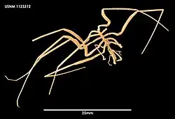 The body of this sea spider is smooth and very slender, and the adult features five pairs of long legs that are similar in size and proportions. Each leg ends in a well developed claw and features four rows of setae on the last four joints. The chelifores are well developed and each feature two joints: the basal segment (scape) and the slender chelae, which are shorter than the scape. The chelae each feature a uniform row of short teeth set closely together. The palps each feature five joints. The ovigers are present in each sex and each feature ten joints with a single row of toothed spines on the four most distal joints and a row of narrow teeth on a claw at the distal end.[6][13][5] Specimens in this genus exhibit significant variation in size.[13] The trunk can range from 2.8 mm to 6.6 mm in length.[5][14] The legs are about five times as long as the trunk and can reach 36 mm in length.[5][13]